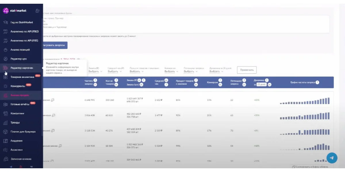| Stat4Market | от 19 900 | Ozon, Wildberries | Бесплатный аудит магазина на Wildberries. Экспертный блог по продвижению, бесплатные базы надежных блогеров для рекламы |