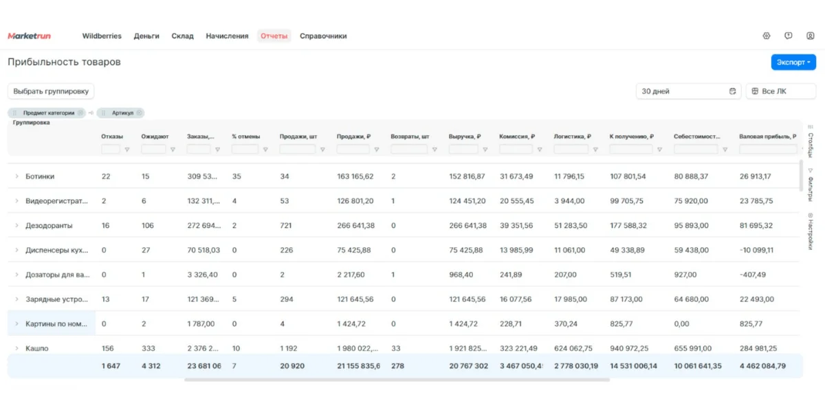 | MarketRun | от 12 300 | Wildberries, Ozon | Пошаговые инструкции и подсказки по ходу работы с программой. Отчеты можно строить в режиме реального времени |