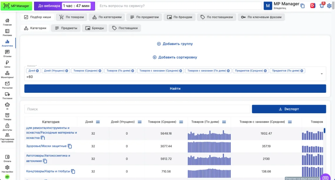 Сервисы аналитики — это программы, с помощью которых продавец или аналитик может анализировать рынок маркетплейса по разным параметрам. Это помогает увеличивать продажи, минимизировать риски и ошибки, сократить расходы и определить нишу, в которой можно заработать.