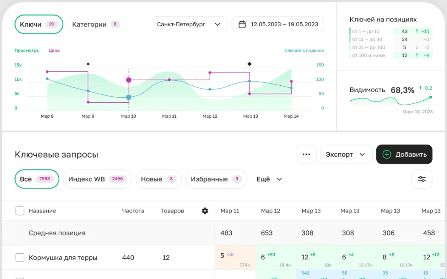 Стоимость: сборный тариф зависит от функционала. Например, отслеживание личного кабинета стоит от 2640 ₽/месяц до 5000 ₽/месяц в зависимости от конкретного маркетплейса (есть 7 дней полного бесплатного доступа)