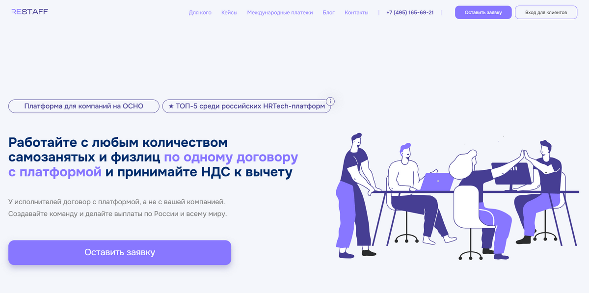 | ReStaff | Один договор для всех исполнителей, поддержка валютных выплат | Базовый лимит выплат до 200 000 ₽, для расширения нужно делать отдельный запрос | Комиссия 4,5–6,5% |