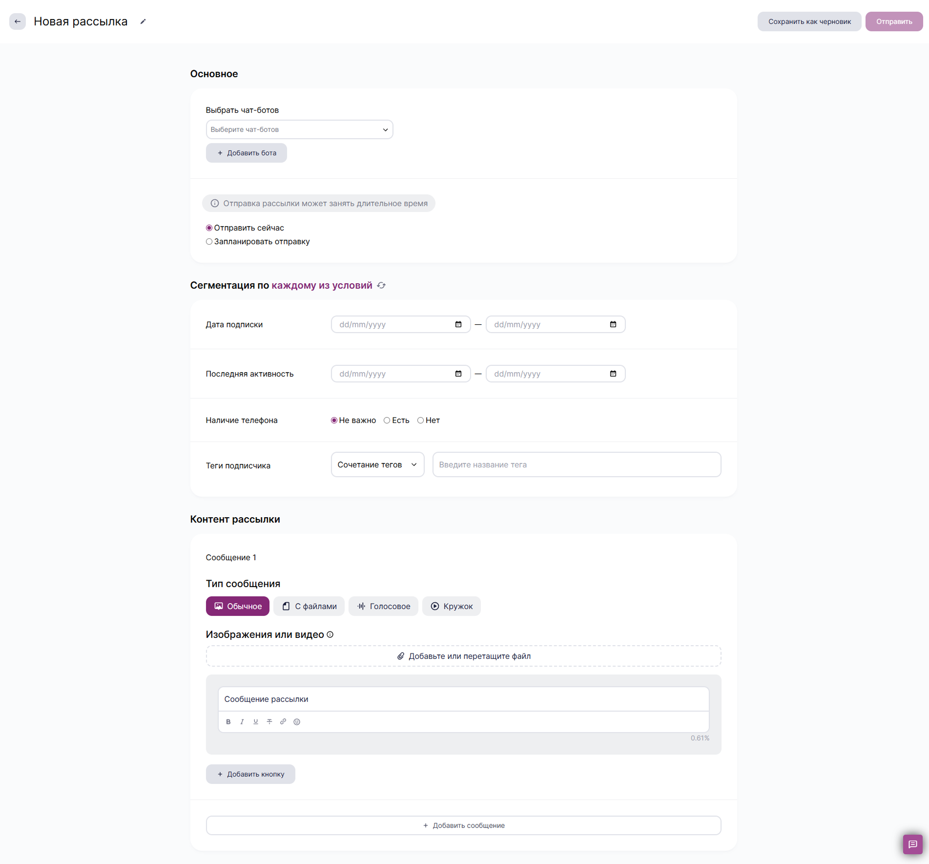 WatBot — это конструктор чат-ботов для Telegram, WhatsApp*, ВКонтакте, Viber и Max в визуальном редакторе. Здесь можно собрать бота под нужную задачу, в том числе и для авторассылок. Доступна отправка разовых сообщений и настройка многошагового сценария, в котором подписчик взаимодействует с ботом после получения рассылки. Возможности сервиса позволяют сегментировать аудиторию, чтобы отправлять подходящий контент.