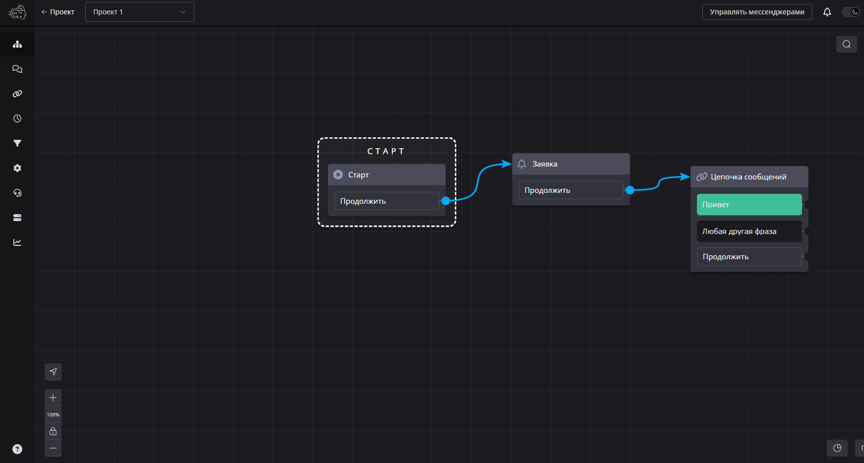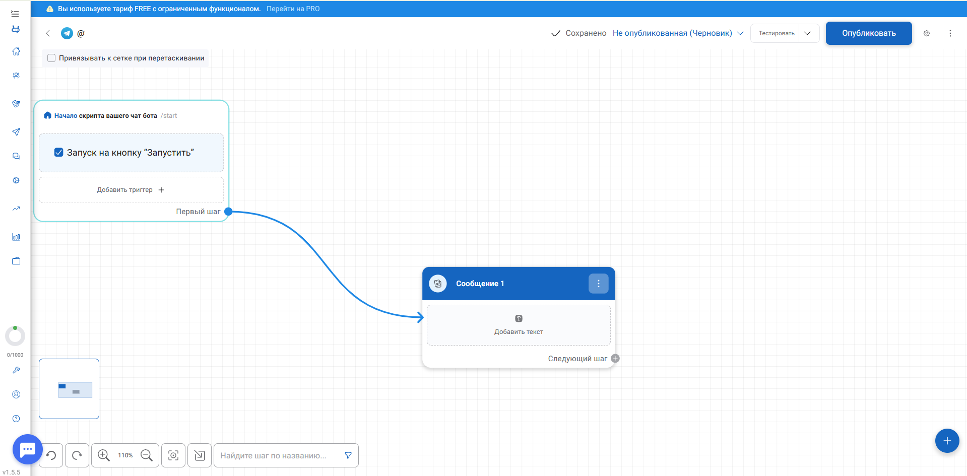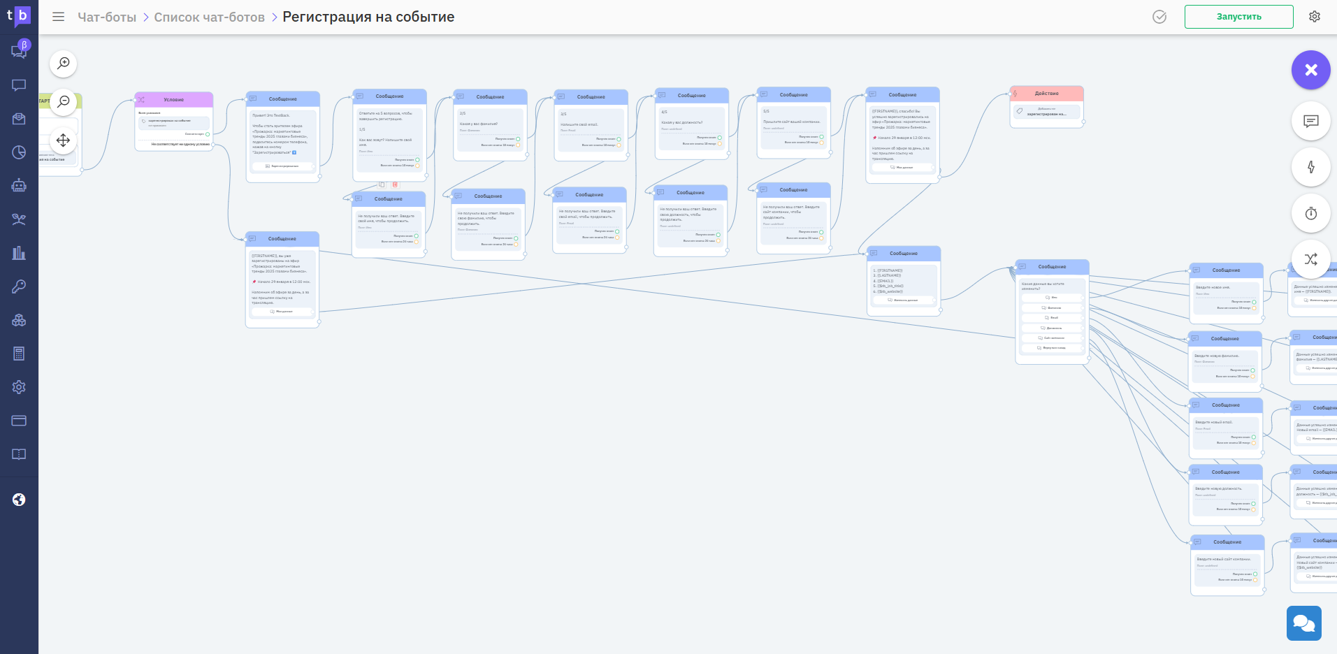 Чтобы создавать чат-ботов и автоворонки на платформе, не нужны навыки программирования. Визуальный редактор помогает собирать сценарии из готовых блоков, включая тексты, кнопки и формы.