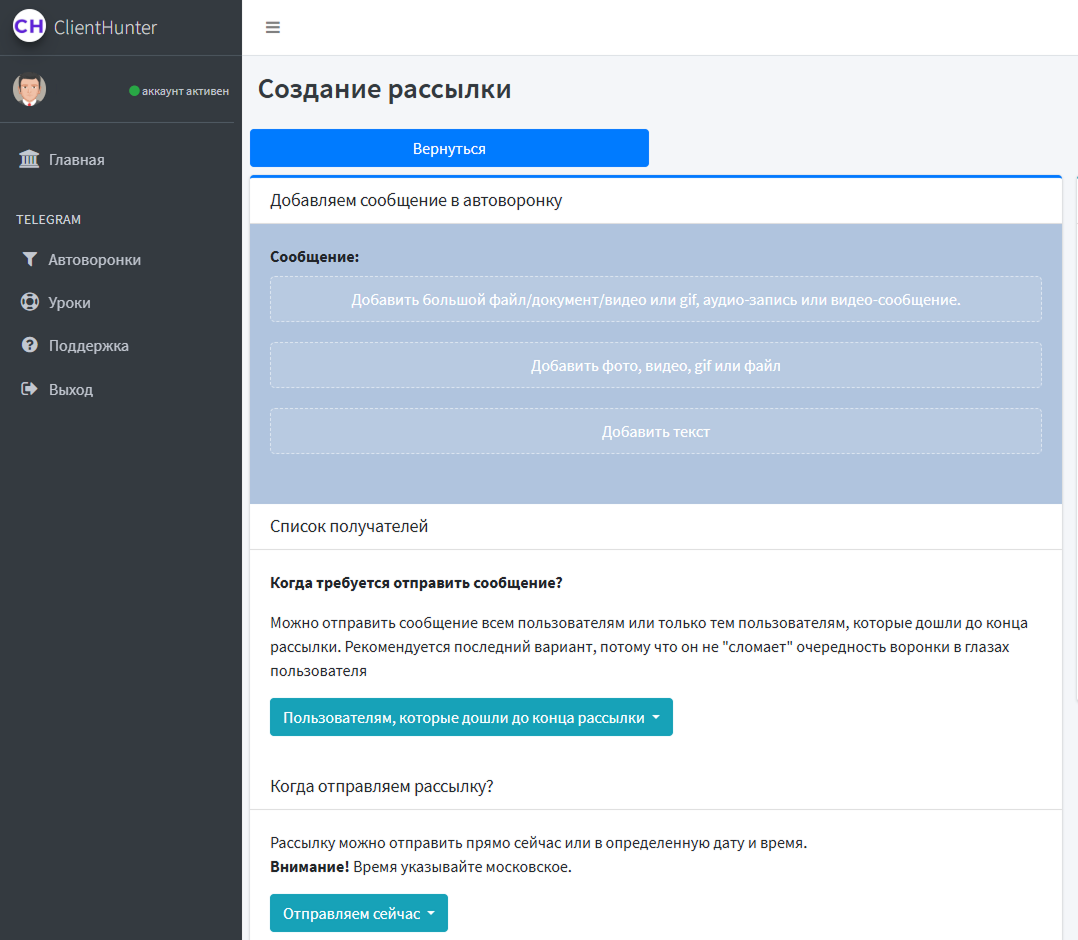 В Client Hunter можно создать чат-бот на специальном конструкторе и настраивать массовую или индивидуальную отправку сообщений. По каждому подписчику можно просматривать историю общения.