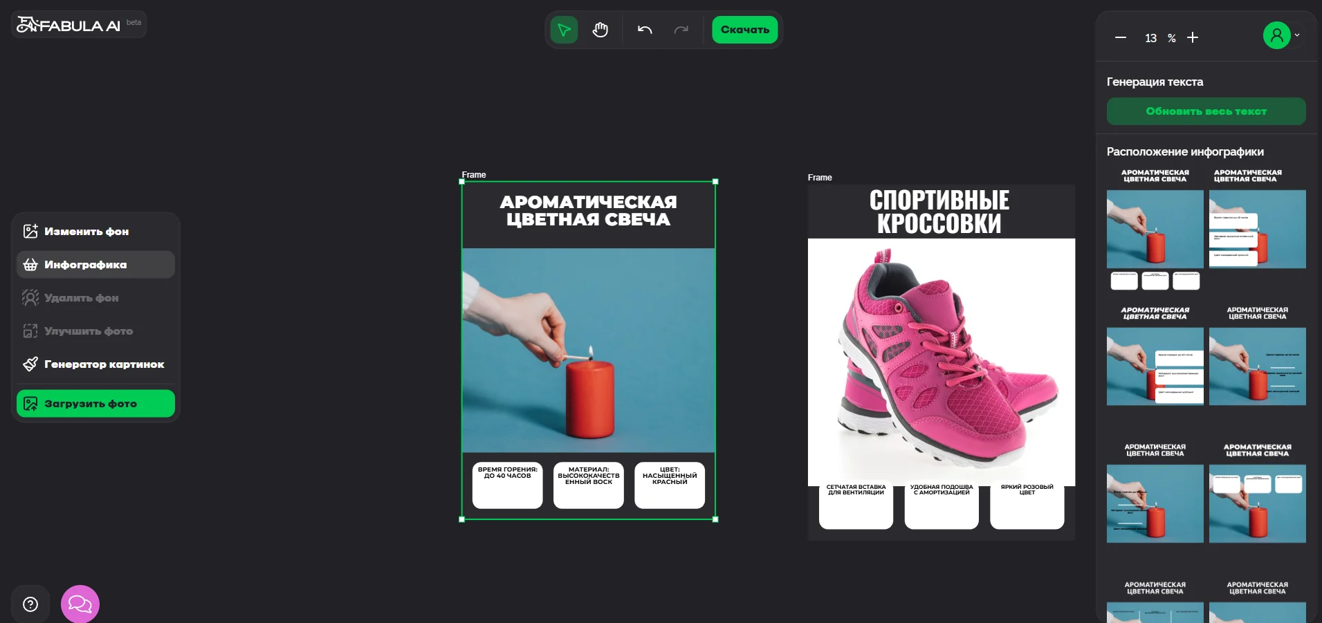 Как работает. Интерфейс не перегружен, не нужно долго разбираться, куда жать, чтобы сделать карточку. Сервис подойдет для простой минималистичной инфографики с описанием преимуществ. Нейронка генерирует текст сама. Инфографику можно сделать за пару кликов: