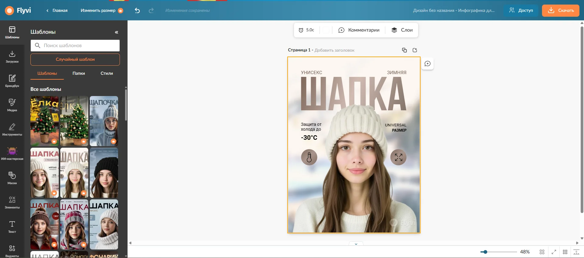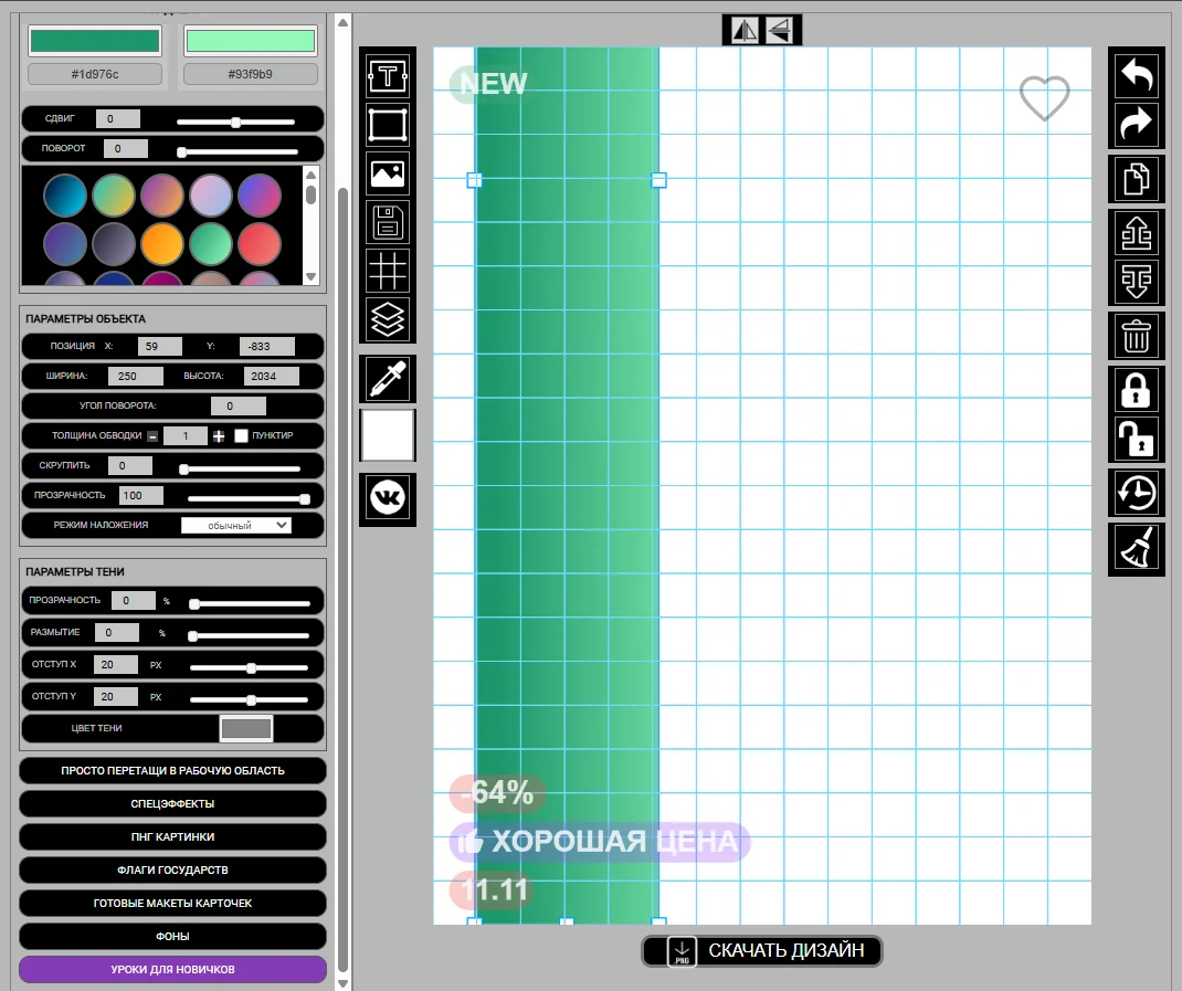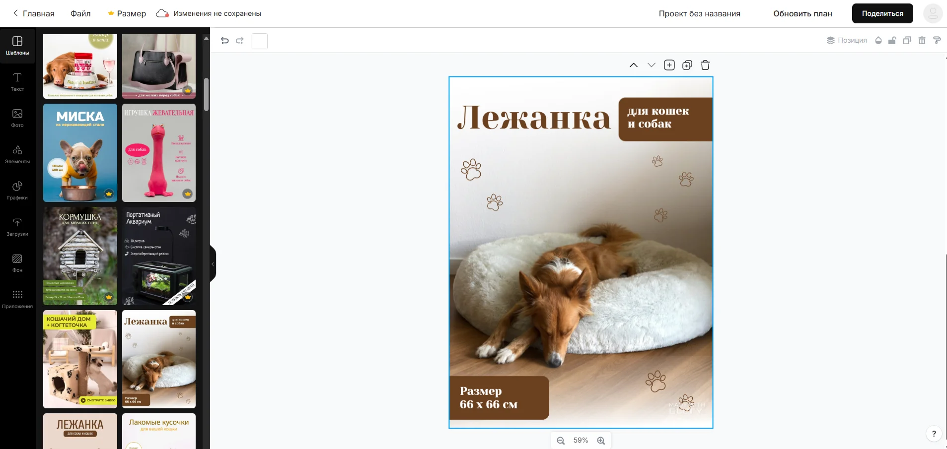Каждый элемент дизайнерского макета можно изменить или заменить. Работать в редакторе удобно ― все функции под рукой: слои, загрузка новых объектов, добавление фигур, смена фона и т. д.