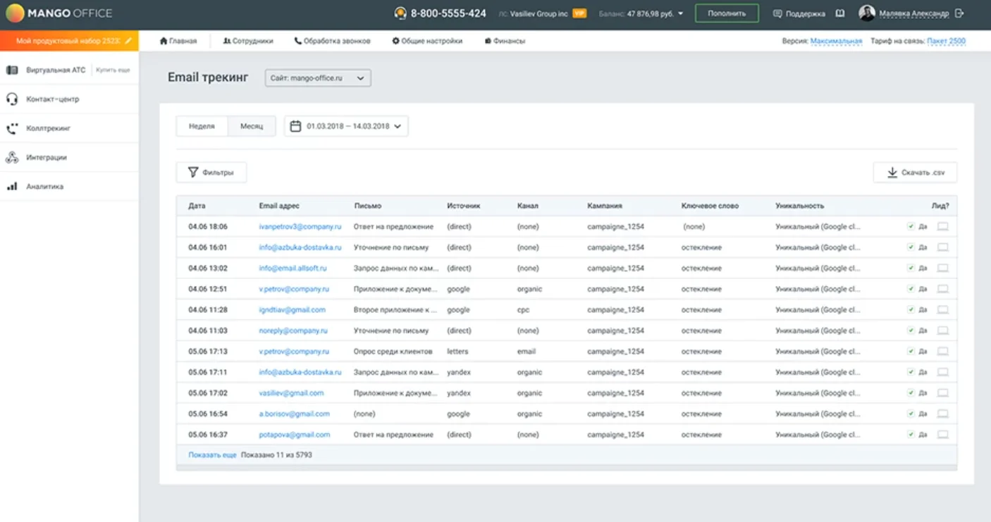 Подключить email-трекинг можно только вместе с другими инструментами вроде коллтрекинга, сквозной аналитики и т.д. Стоимость подписки стартует от 6600 ₽/мес. Она подойдет сайтам, которые посещают до 60 000 раз в месяц.