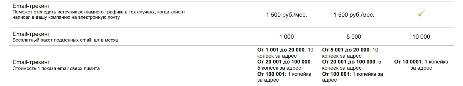 Подключить email-трекинг от Аллоки можно вместе с любым тарифом коллтрекинга. Стоимость тарифного плана начинается от 2990 рублей в месяц и включает 3-дневный тестовый период.