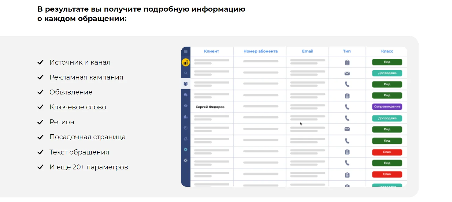 Также по каждому обращению информация будет передаваться в CRM-систему. На основе собранных данных сервис формирует специальный отчёт, доступный в личном кабинете. Результаты отслеживания можно интегрировать со сквозной аналитикой.