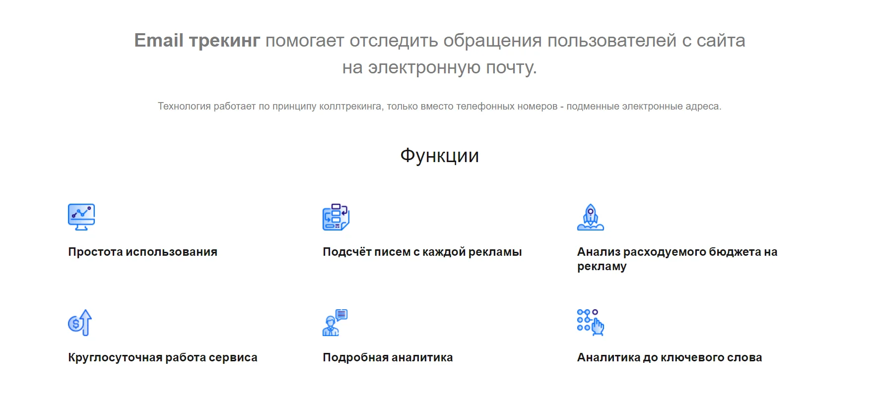 Динамический email-трекинг. Каждому уникальному посетителю сайта показывают отдельный email. Это позволяет детально анализировать обращения — от определённого канала и рекламного объявления до конкретного ключевого слова.