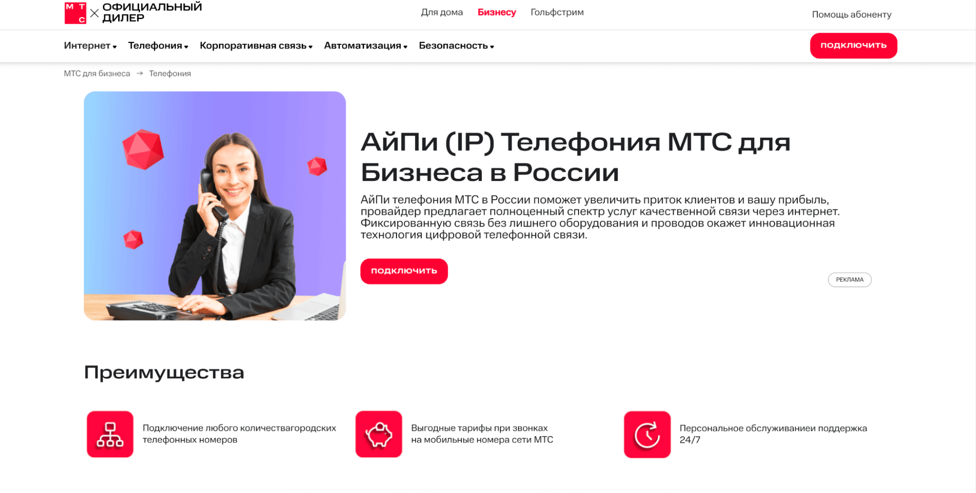 IP-телефония для бизнеса от МТС — часть экосистемы компании. Они предлагают те же преимущества, что и оператор сотовой связи: делают акцент на работе с мобильными номерами и отмечают хорошее покрытие по всей стране.