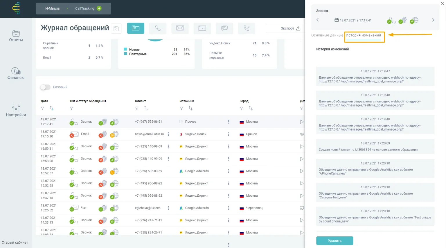 В личном кабинете отображается детальная информация по обращениям: контакты клиентов, точное время и продолжительность звонков, стоимость звонка. Здесь же находятся записи обращений.