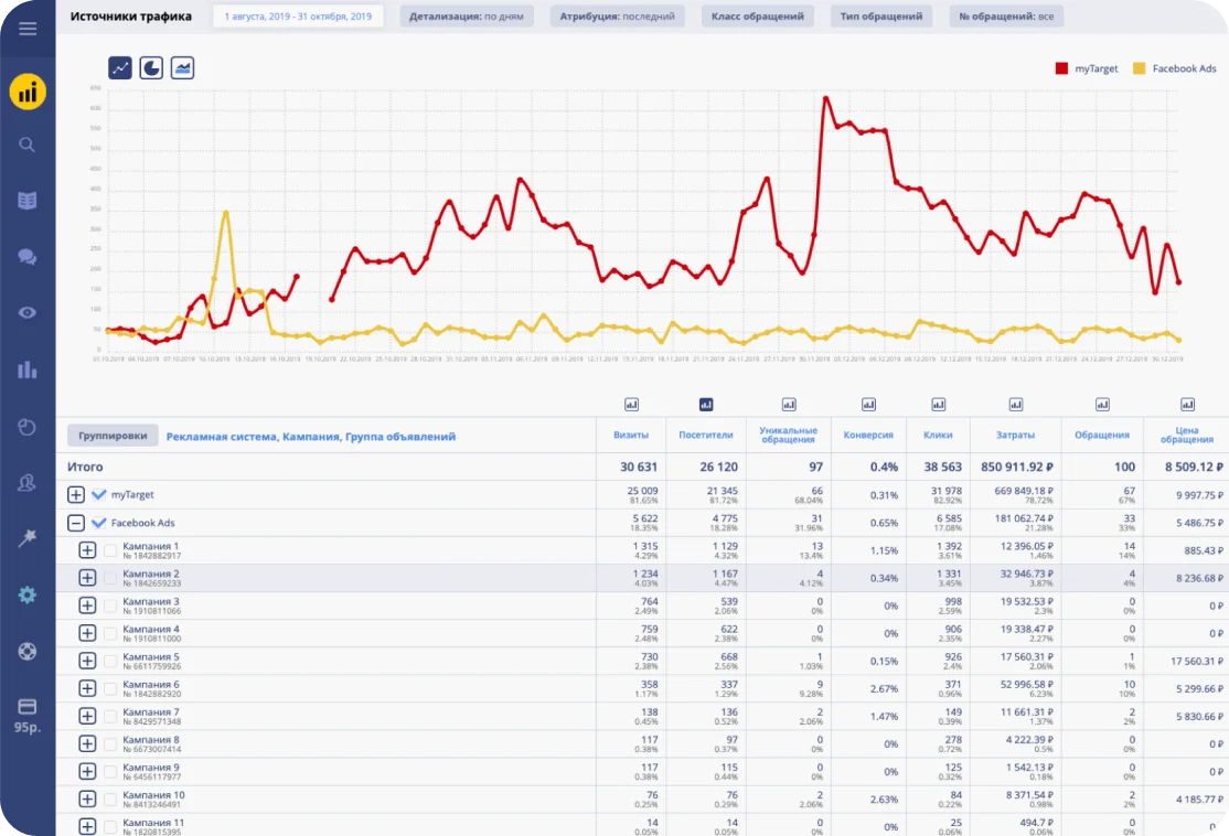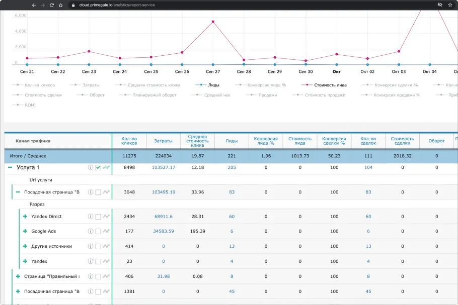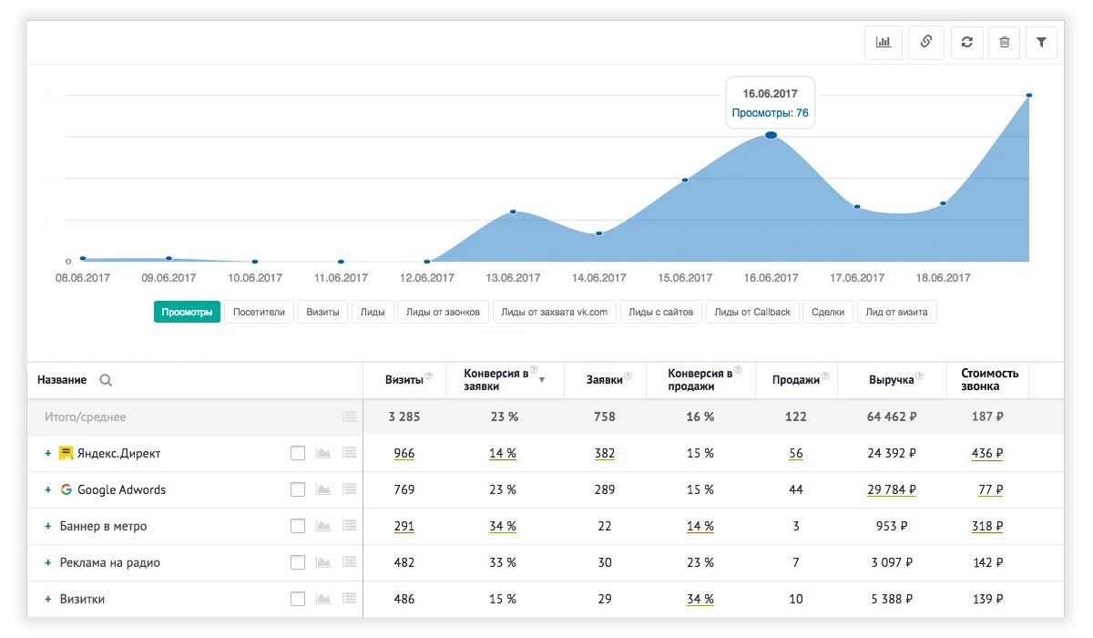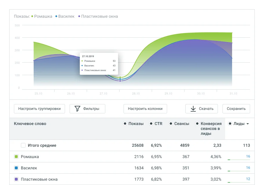 Сервис показывает сквозную аналитику и запоминает ключевые слова, по которым прошло наибольшее количество лидов.