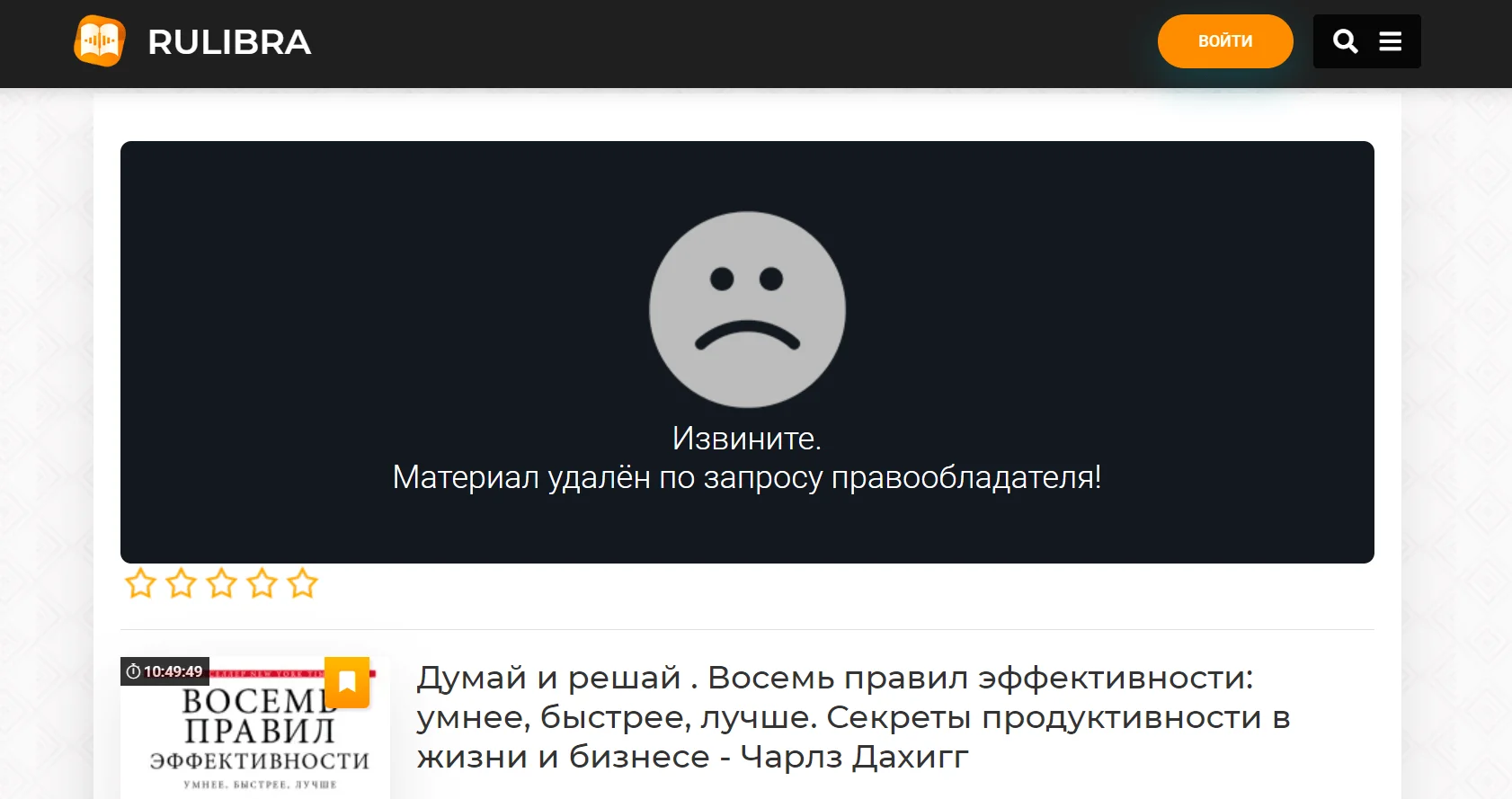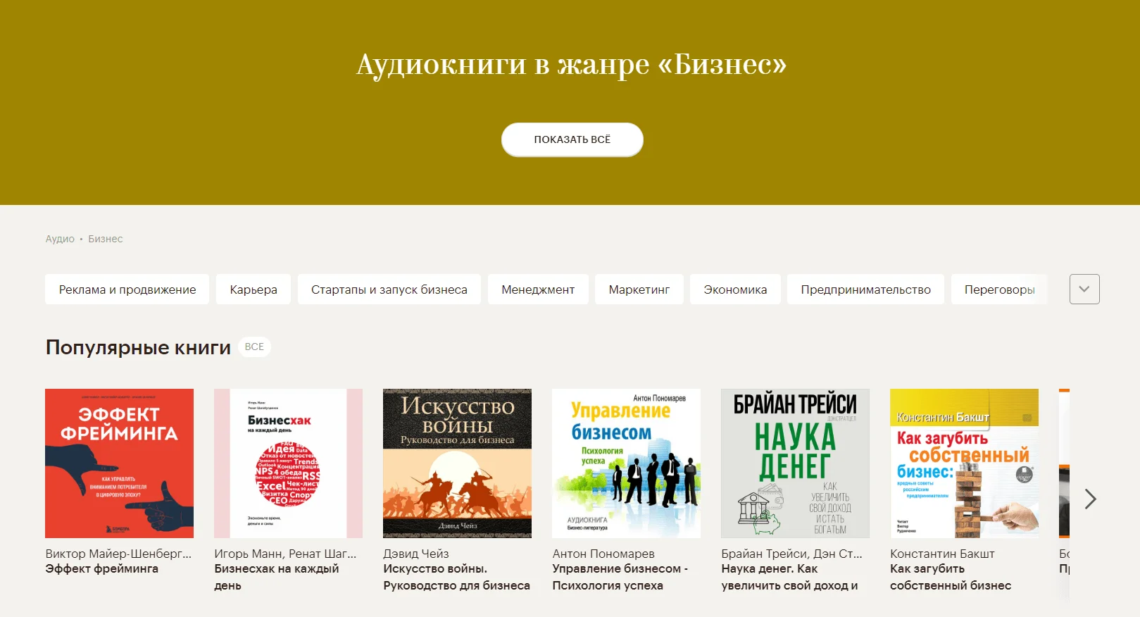 В разделе «Бизнес» доступно 200+ аудиокниг. Любой материал можно слушать без регистрации. При переходе на страницу сайта можно почитать краткое описание содержания, имя чтеца, длительность. Подписка позволяет участвовать в комментариях, подписываться на выбранных чтецов или жанры, собирать свою полку.