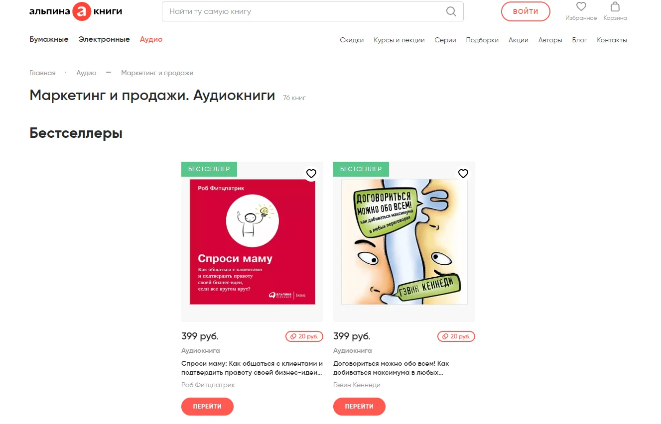 На сайте издательства «Альпина» бизнес-книги представлены в категориях «Бизнес» (230+ изданий) и «Маркетинг и продажи» (70 изданий). На странице каждой книги есть описание и основные характеристики. Однако демо-фрагмент доступен только в виде текста. Прослушать отрывок из материала в формате аудио нельзя.