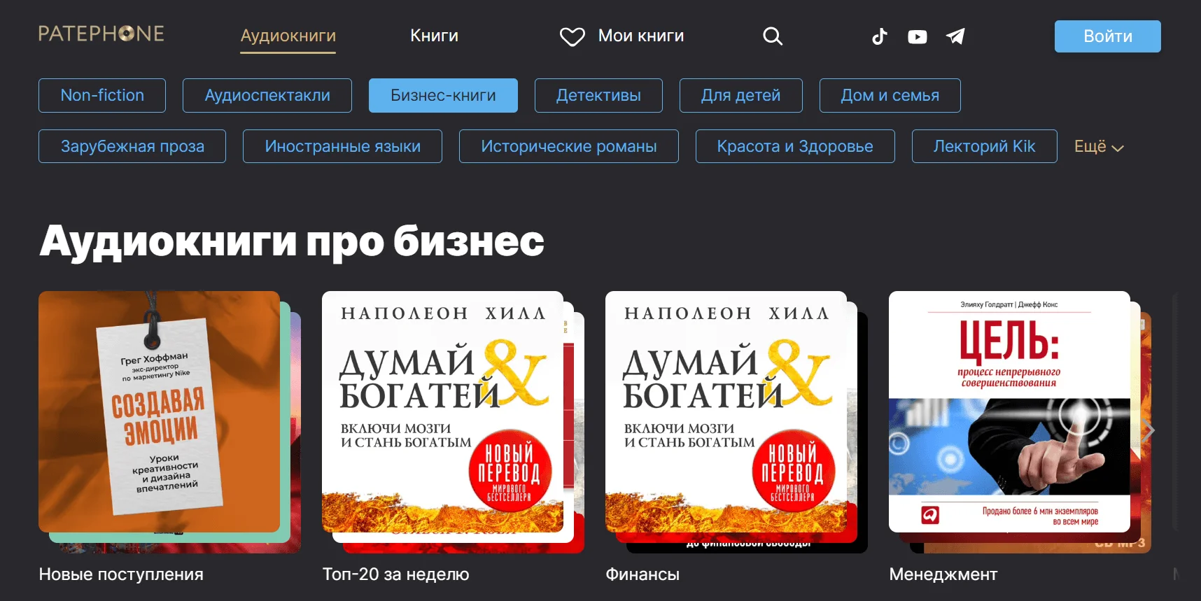 В сервисе Patephone в категории «Бизнес-книги» доступно 500+ изданий. При этом можно выбирать книги из специальных тематических подборок на тему маркетинга, карьеры, бизнеса, менеджмента, финансов и прочего. По каждому изданию можно посмотреть длительность, имя чтеца и краткое описание. Также без регистрации можно послушать отрывок из книги.