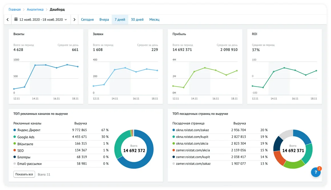 Платформа обещает максимально чистые данные из всех источников трафика в режиме одного окна. Есть встроенные инструменты для коллтрекинга, email-трекинга, анализа заявок из мессенджеров, онлайн-чатов и форм захвата лидов на сайте. Будет полезен, если компания регулярно выделяет большие бюджеты на контекстную рекламу и оптимизирует посадочные страницы на основе данных.
