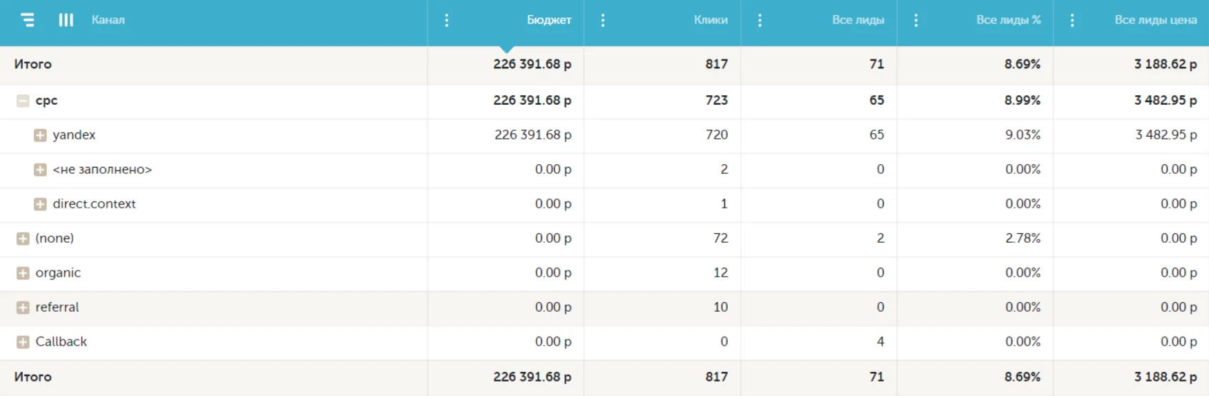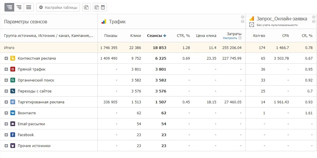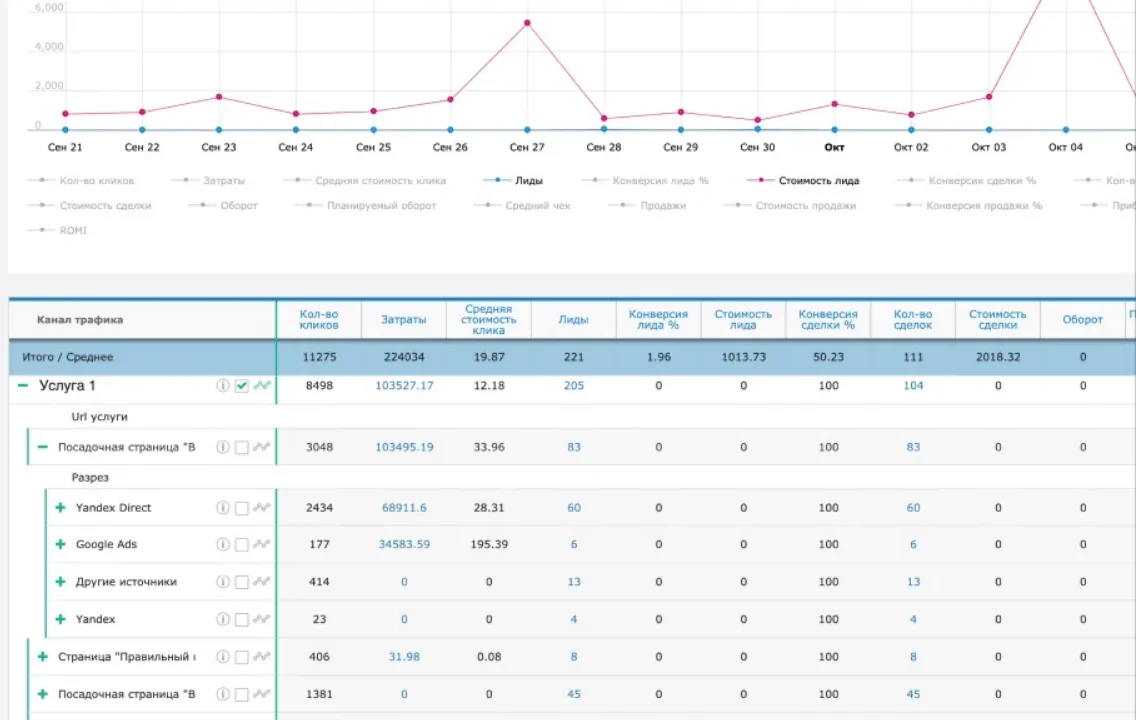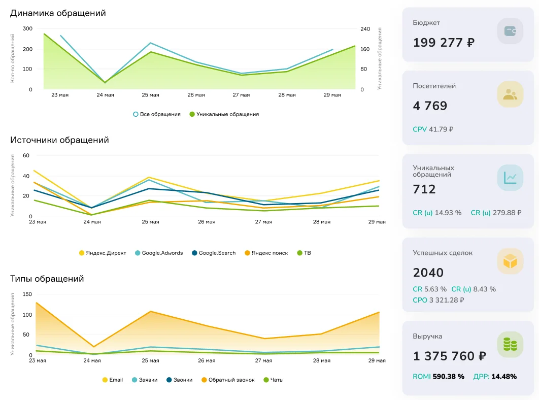 Сервис показывает, из каких каналов приходят лиды на сайт, сколько стоит каждая заявка, окупаются ли вложения в рекламу и маркетинг. Эффективность контекстной рекламы можно оценивать до уровня ключевых слов, а детализация заявок по типу обращений — звонок, онлайн-чат, сообщения в мессенджеры — позволит оптимизировать посадочные страницы и повысить конверсию в лида.