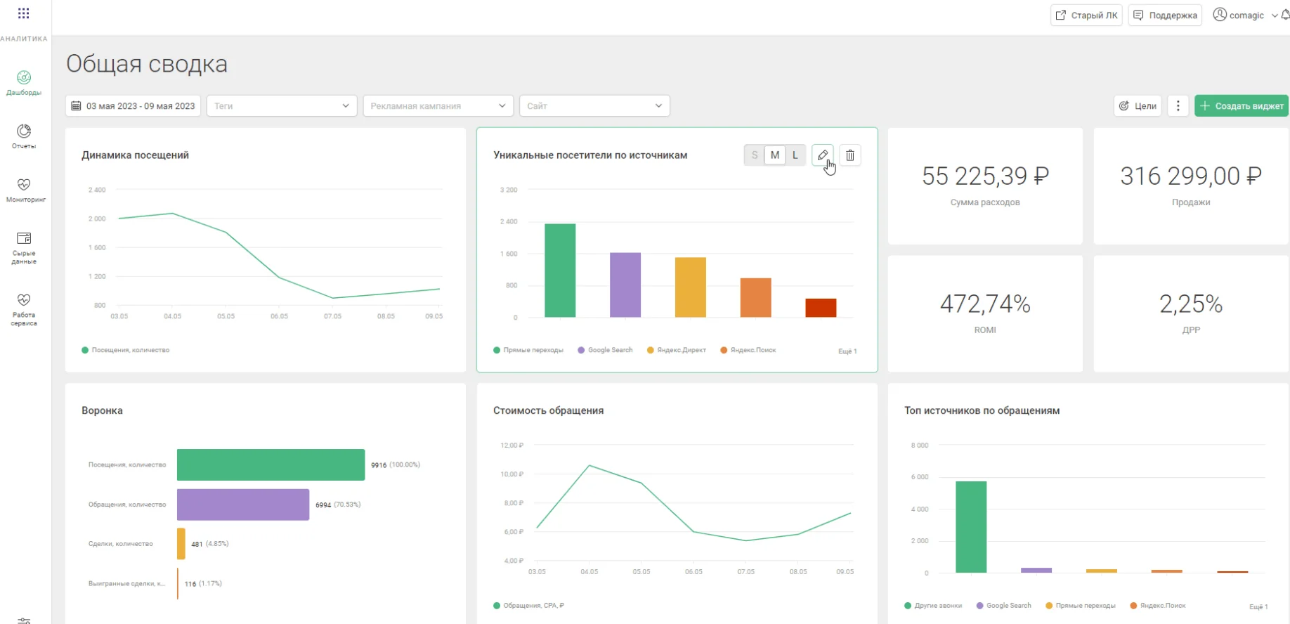 CoMagic формирует нативные отчеты, которые можно настроить по своему усмотрению — например, собирать детальную статистику по всем каналам или отображать только важные показатели на дашбордах.