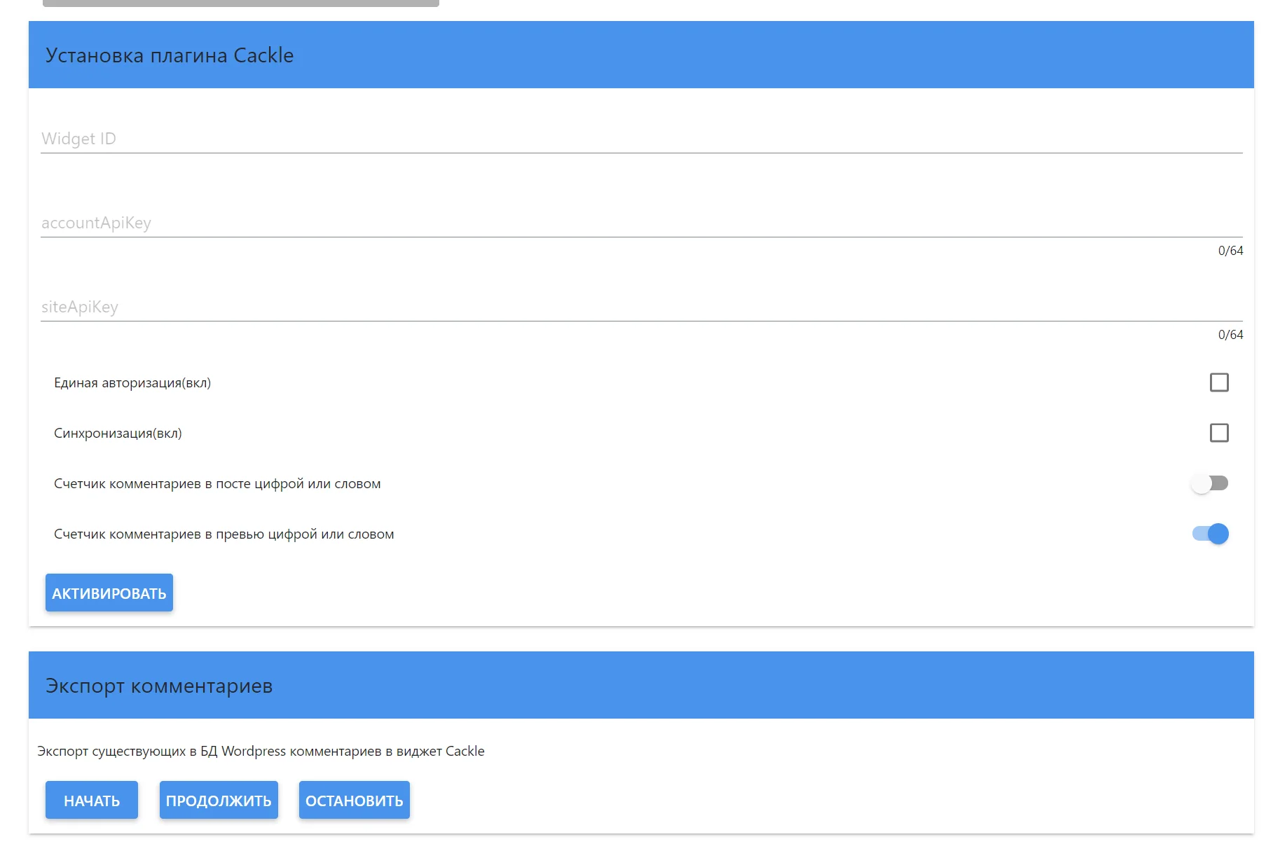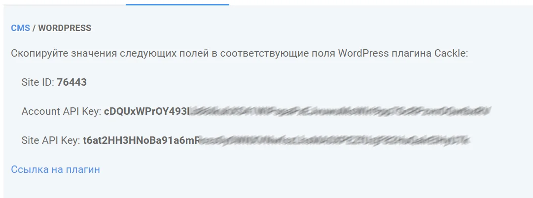 Во втором случае для активации Cackle также понадобятся два ключа, которые вы можете взять здесь же, в личном кабинете на сайте сервиса.