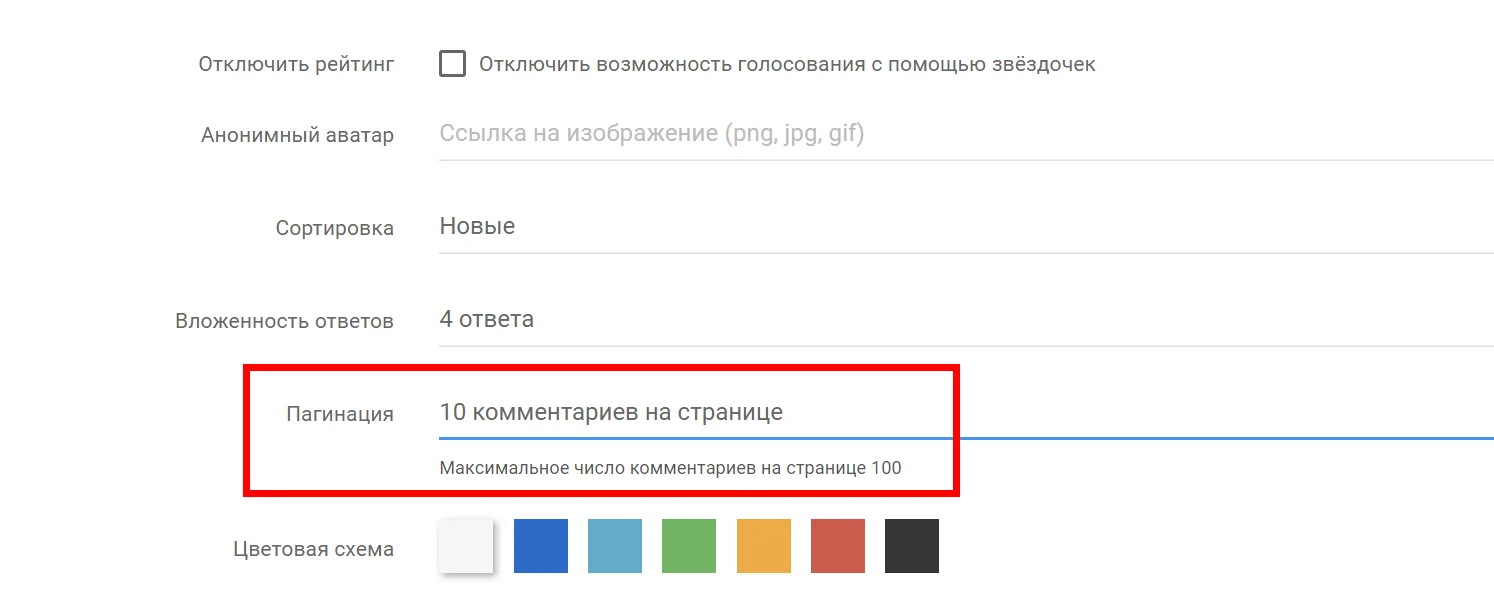 Я рекомендую активировать модерацию всех комментариев, содержащих URL, а также выбрать максимальное количество комментариев, которые будут выводиться на странице:
