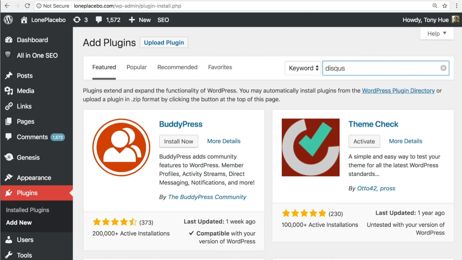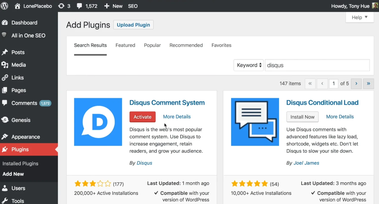 Покажу, как установить Disqus на WordPress. Самый простой способ — открыть административную панель, выбрать раздел «Плагины», выбрать «Установленные» и в поисковой строке ввести Disqus: