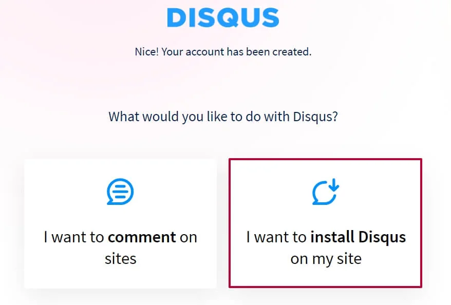 Теперь будем устанавливать модуль на свой сайт. Для этого выбираем пункт «I want to install Disqus on my site»: