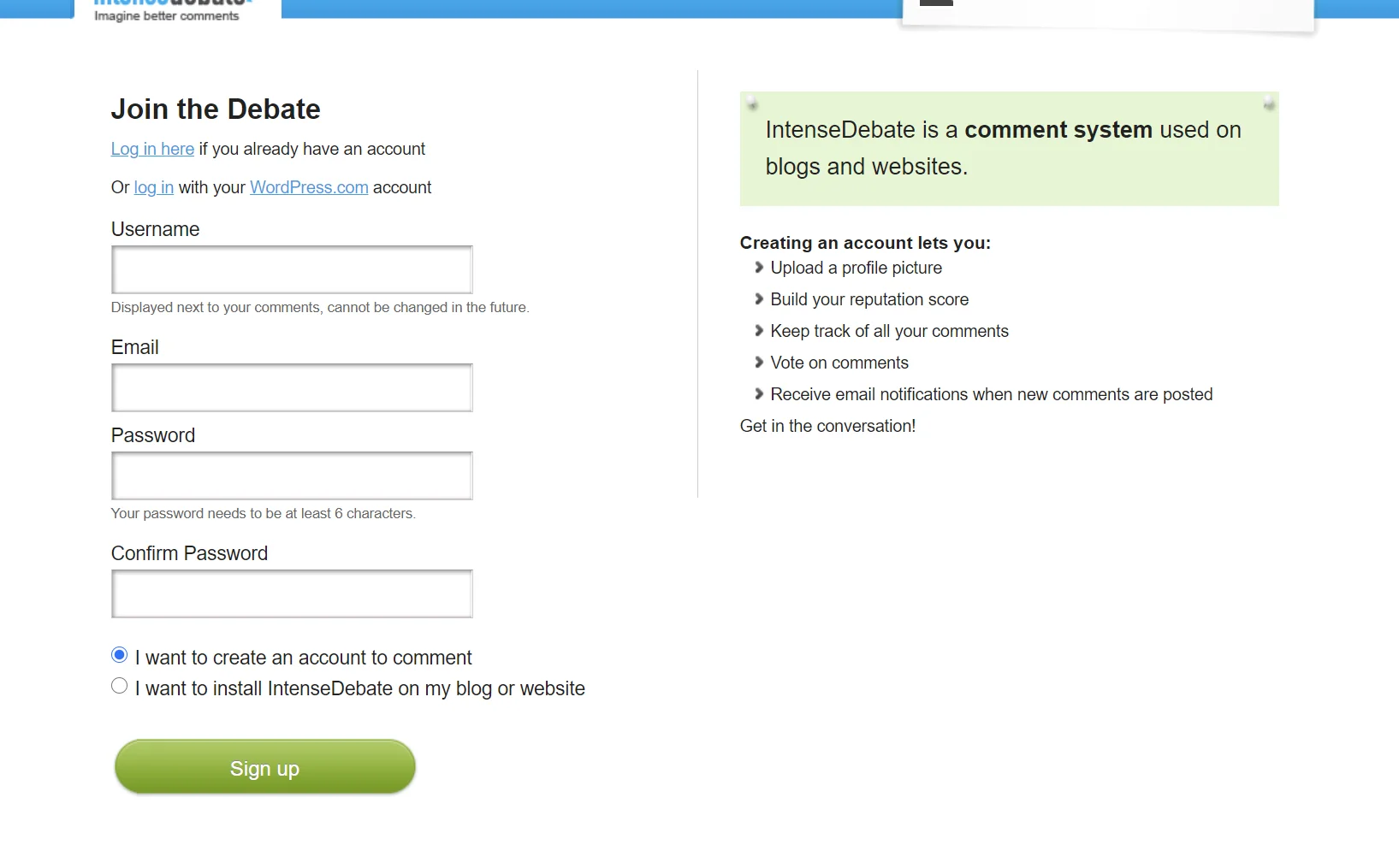 И попадаем на страницу регистрации. Заполняем анкету и в самом низу отмечаем чекбокс «I want to install IntenseDebate on my blog or website»: