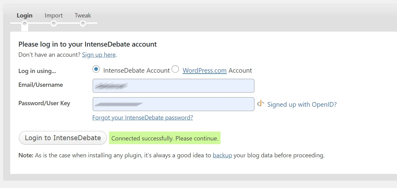 Открываем админку своего сайта, в разделе «Плагины» вводим в поисковой строке название IntenseDebate. Устанавливаем плагин и открываем его. Вводим данные от своего аккаунта IntenseDebate и еще раз проходим авторизацию: