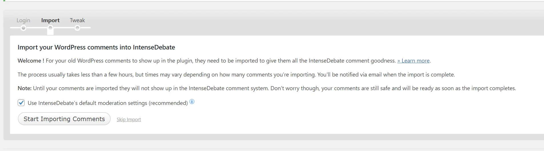После того как мы залогинились, IntenseDebate предложит импортировать существующие комментарии. Для этого выбираем пункт «Start Importing Comments»: