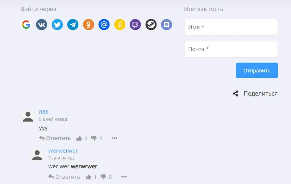 Из минусов — нет поддержки отечественных соцсетей (того же ВКонтакте). Поэтому пользователям придётся авторизовываться по почте, чтобы оставить комментарии.