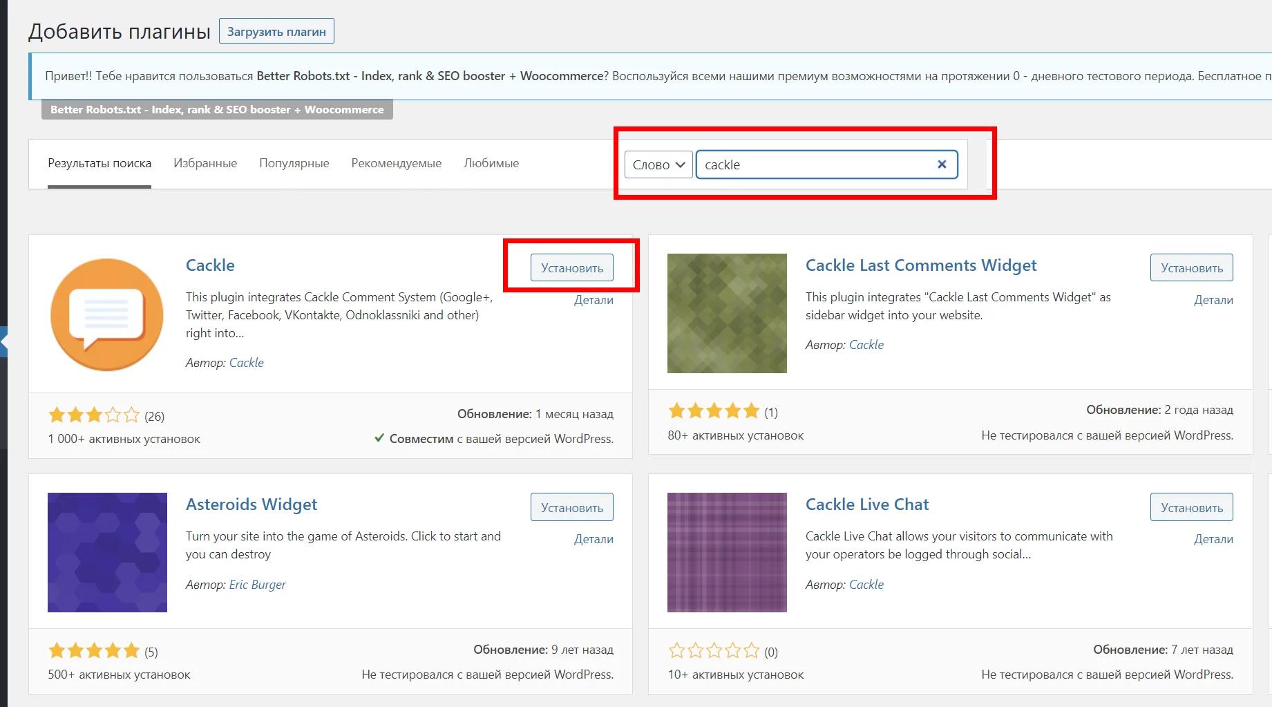 Здесь в поисковой строке вводим «Cackle» и выбираем пункт «Установить»: