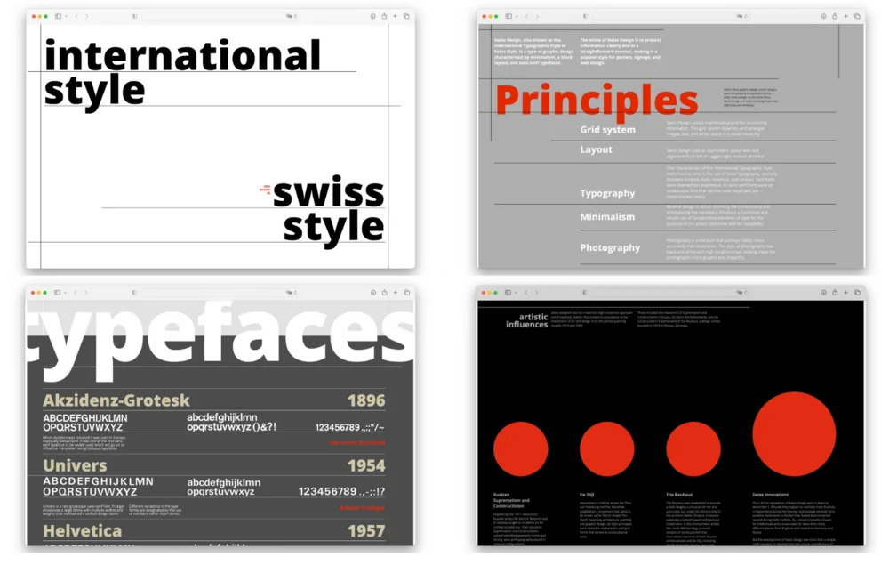 Принципы швейцарского стиля сформировались задолго до появления компьютеров и интернета, но в веб-дизайне они раскрылись по-новому. То, что придумали дизайнеры середины XX века, идеально подходит для цифровой среды — где важны скорость восприятия, структура и комфорт пользователя.