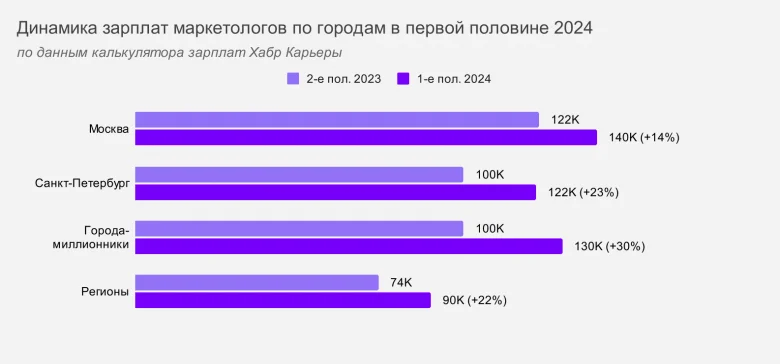 По данным Хабр Карьера, медианная зарплата в Москве составляет около 140 000 ₽, в Санкт-Петербурге — 123 000 ₽. В городах-миллионниках цифры ниже. Например, в Екатеринбурге маркетологи с опытом зарабатывают от 80 000 до 130 000 ₽, а в Новосибирске средний диапазон находится на уровне 60 000–80 000 ₽.