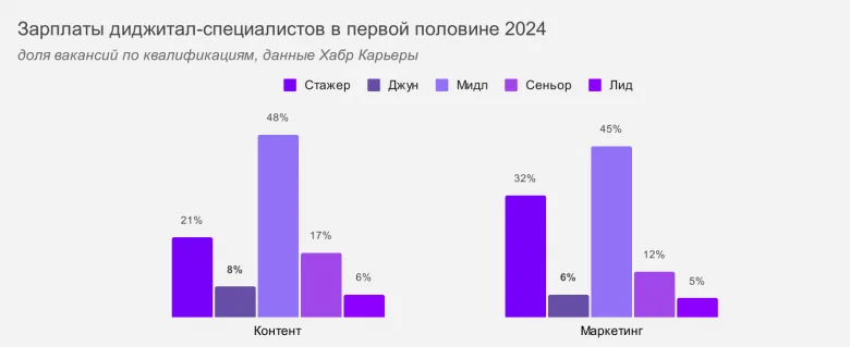 По данным Хабр Карьера, самые востребованные специалисты — это Middle-маркетологи. Компании рассчитывают на специалистов, которые умеют самостоятельно вести проекты и обеспечивать результат, при этом их зарплатные ожидания остаются ниже, чем у Senior или руководителей.