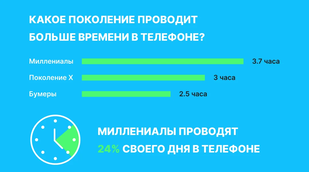 Смартфон – неотъемлемая часть жизни любого человека. Он всегда под рукой и часто используется для развлечений и переписок. Это подтверждает исследование whistleOut: по его результатам человек, в зависимости от возраста, в среднем тратит на телефон от 2,5 до 3,7 часов в день.