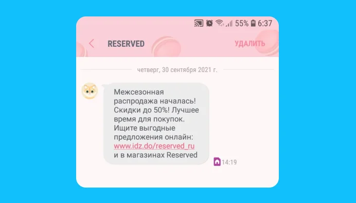 Срочность. Клиент видит SMS почти сразу после отправки, а не как в email, когда почту могут открывать раз в несколько дней. Это выручает при ограниченных во времени предложениях: накануне праздников, Черной пятницы или просто во время высокого сезона. В такие периоды важно, насколько быстро человек ознакомится с предложением, ведь оно быстро теряет актуальность. Да и само SMS ассоциируется с чем-то срочным.