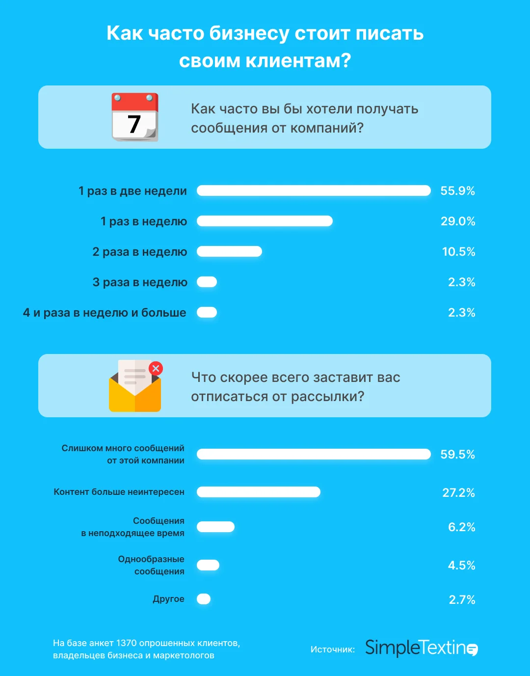 Перевод инфографики с исследования Simple Texting о предпочитаемой регулярности рассылки и причинам отписки. Вопросы в рамочках как раз спрашивали у пользователей. Для почти 60% пользователей, слишком много сообщений — главная причина для отписки
