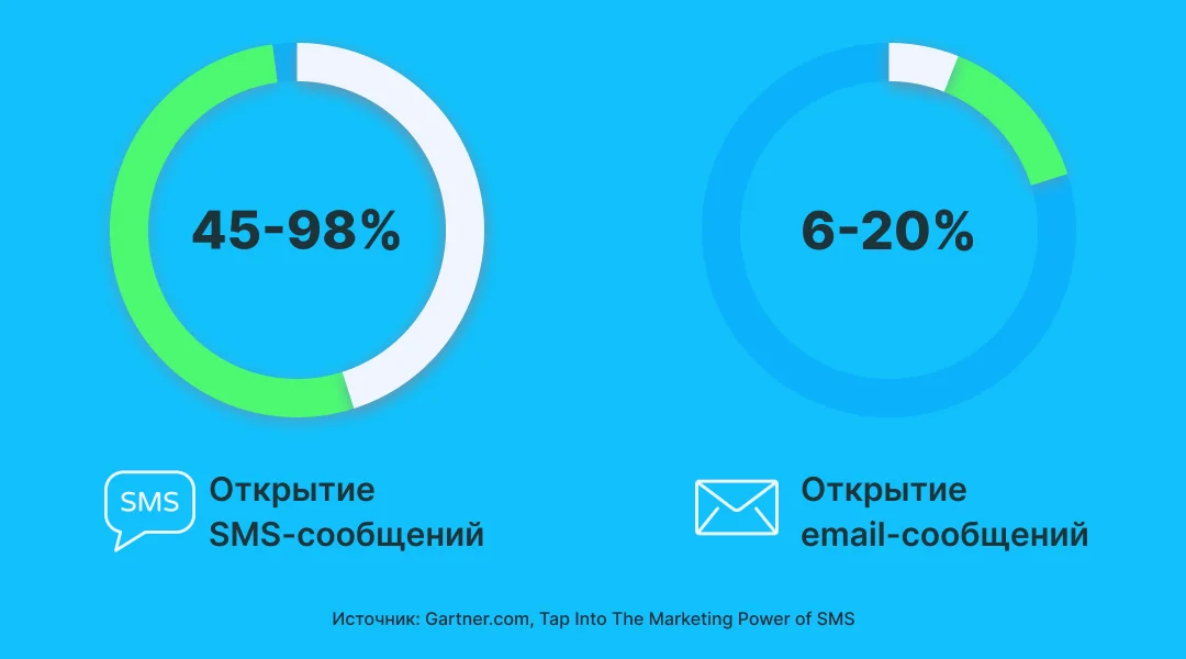По данным Gartner открываемость SMS-сообщений в среднем в 5 раз выше, чем у email-сообщений