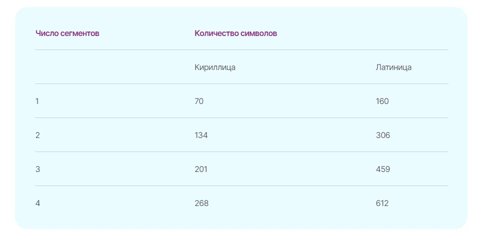 Дороговизна. Цена одного SMS в среднем от 2 до 3 рублей. Однако, это стоимость лишь за один сегмент сообщения. Сегмент — это часть SMS в символах. Всего в SMS максимум помещаются 268 символов на кириллице — это 4 сегмента. Каждый сегмент начинается со своей отметки количества символов: