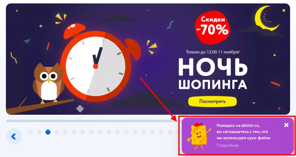 ✅ Новый пользователь сайта получает уведомление о сборе персональных данных через cookies.