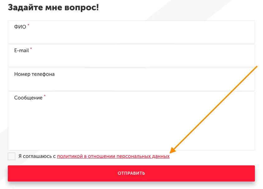 Добавьте в каждую форму на сайте пустой чек-бокс для согласия на передачу данных. Любая форма, включающая пользовательскую информацию, должна содержать похожий текст: «Нажимая на кнопку, вы подтверждаете согласие на обработку персональных данных».