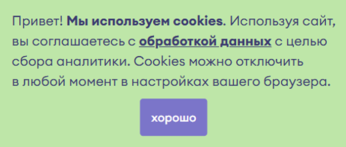 К сообщению об использовании куки-файлов важно привлечь внимание пользователя, а также преподнести эту информацию позитивно — чтобы человек согласился сразу на использование всех куки или, если опции выбора нет, просто не испытывал лишних подозрений в отношении бренда. Одни компании стараются выделиться интересным дизайном попапа, а другие — акцентируют внимание на забавном (или просто искреннем) тексте. Рассмотрим интересные решения для обоих случаев.