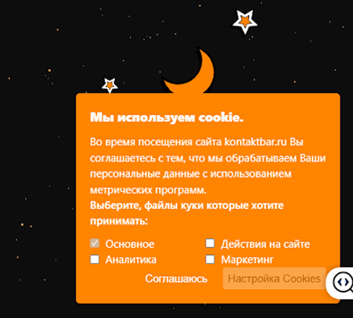 Ниже — пример от «Контакт Бара» в фирменных тонах и с возможностью настройки. Как раз выбор из 4 категорий cookies, о которых мы писали выше: