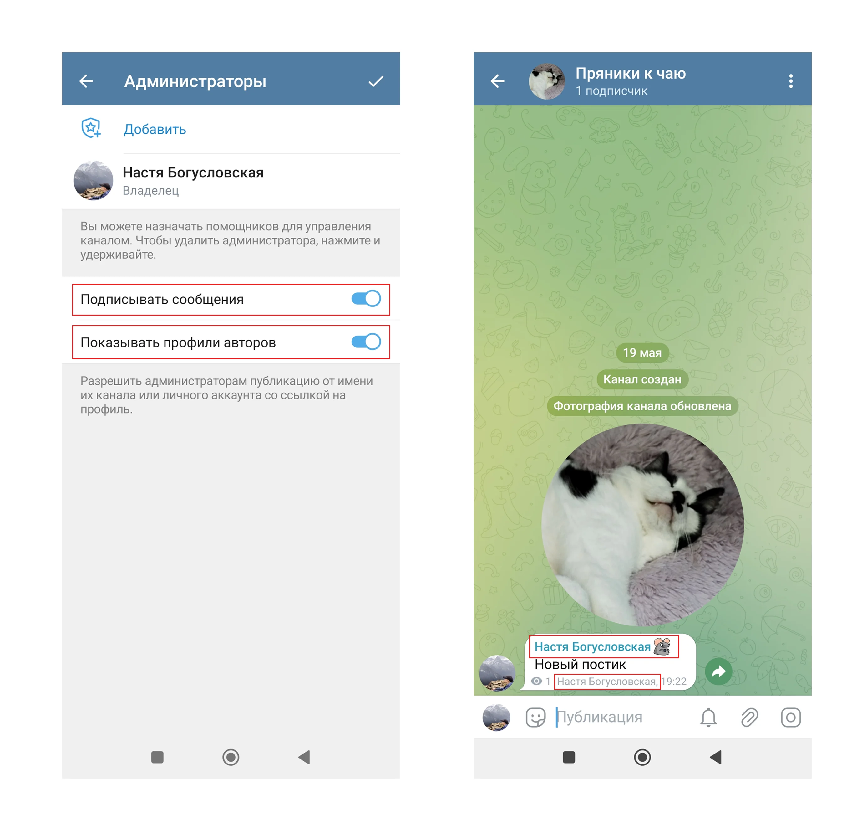 Включить опцию «Подписывать сообщения» или «Показывать профили авторов». Так читателям канала Telegram всегда будет видно, как зовут администратора — автора поста. Это удобно, если в канале несколько администраторов и нужно показывать, кто именно опубликовал пост.