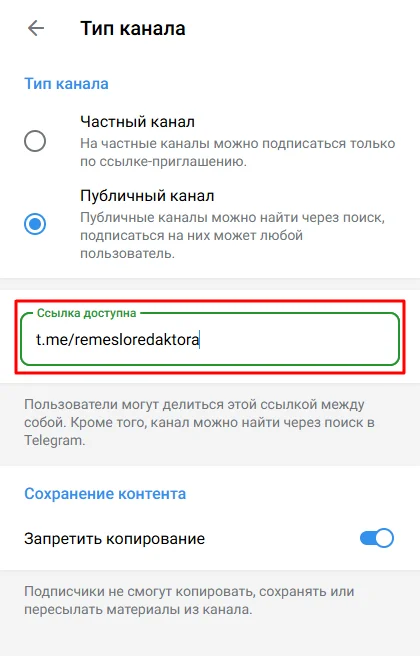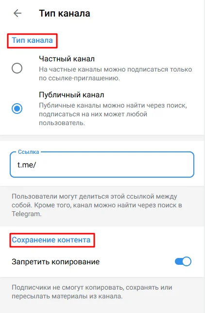 5. Выбрать тип канала в настройках: публичный или частный. На этом же этапе можно запретить копирование контента из канала.