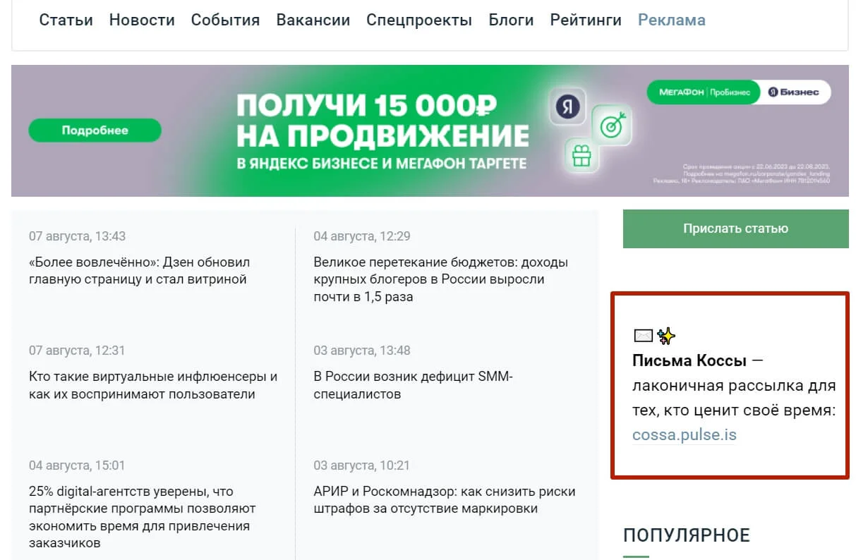 Хороший способ собрать или увеличить базу подписчиков — прорекламироваться у партнёра в рассылке. Если ваши аудитории максимально схожи, так можно привлечь релевантную базу.