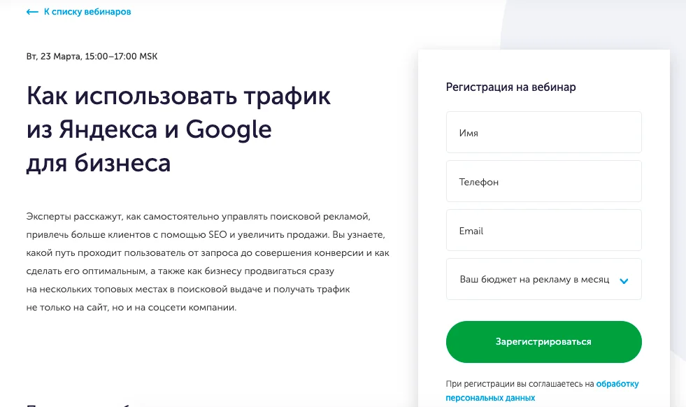 Целевую аудиторию компании можно привлечь с помощью вебинара, а участников добавить в базу подписчиков. Такой способ сбора базы подойдёт для обучающих, авторских и B2B-проектов.