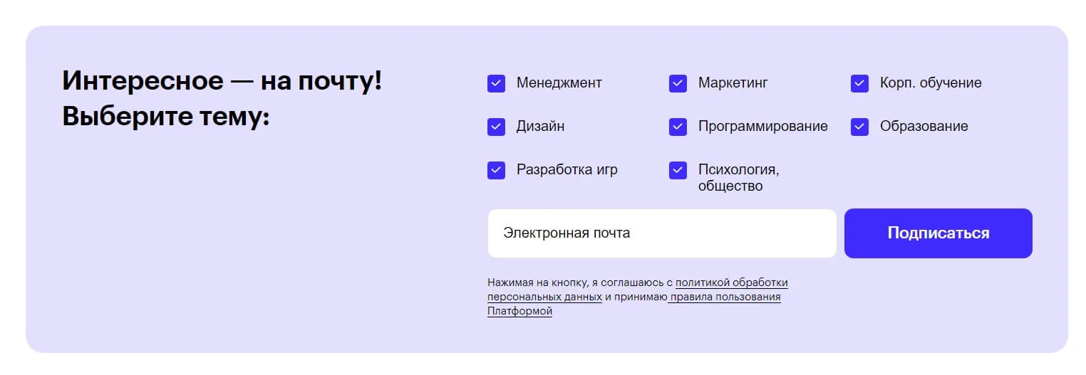 Если сегментов рассылок много, стоит подумать, чтобы развести страницы подписки индивидуально. Так каждая аудитория сможет подробнее изучить описание email и подписаться.