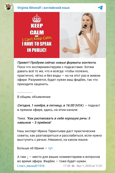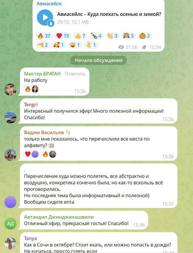 Приготовьтесь, что смотреть эфир в онлайне будет далеко не вся аудитория. В Telegram это нормально. Но если сделать качественно, а потом выложить запись — многие досмотрят в удобное время. Главное, чтобы было ощущение, что эфир стоил того, чтобы его сохранить.